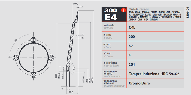 Ніж для слайсера 300мм / 57мм 4 отвори 254 (нержавіюча сталь С45) RGV, Beckers, Sirman, Celme, Bizerba, Graef та ін.