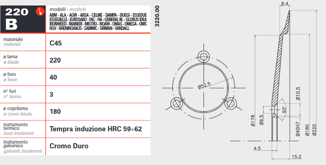 Універсальний тефлоновий ніж - зовнішній діаметр 220 мм / внутрішній діаметр 40 мм / 3 отвори під кріплення.